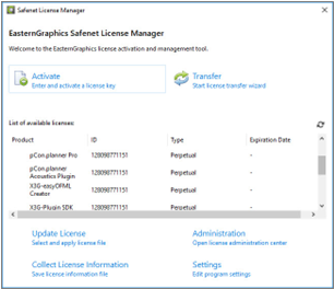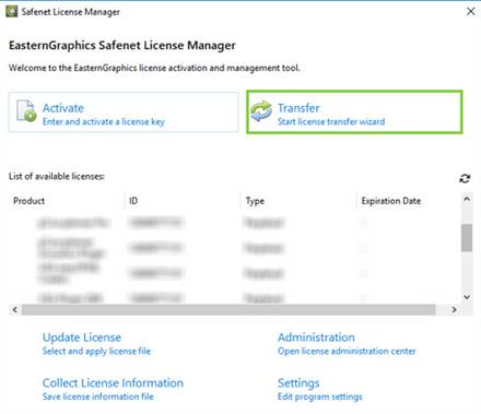 If you want to transfer a license from one computer to another computer, for example after the purchase of a new computer, you can do this yourself via the Safenet License Manager via Transfer: Start license transfer wizard.